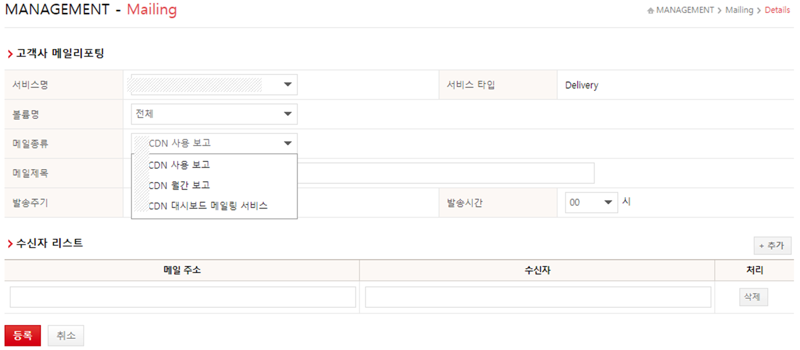 고객사는 “Management” → “Mailing” 메뉴로 이동합니다. 서비스명에 따라 트래픽 통계 정보를 받아볼 수 있도록 설정하는 방법은 아래와 같습니다.