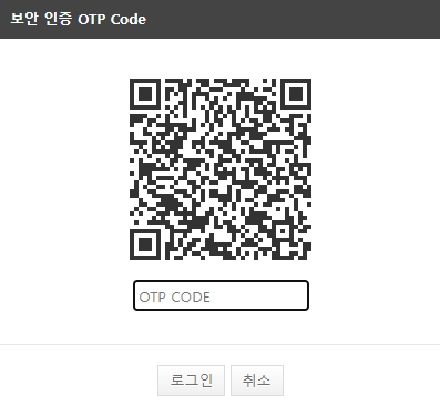 1. OTP 코드 입력을 통한 로그인이 처음 일 경우 OTP등록을 위한 QR 코드가 화면에 표시 됩니다.