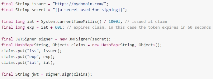 Java-jwt 라이브러리를 사용하여 토큰을 생성하는 예제입니다. 자세한 설명은 공식 사이트를 참고하시길 바랍니다.